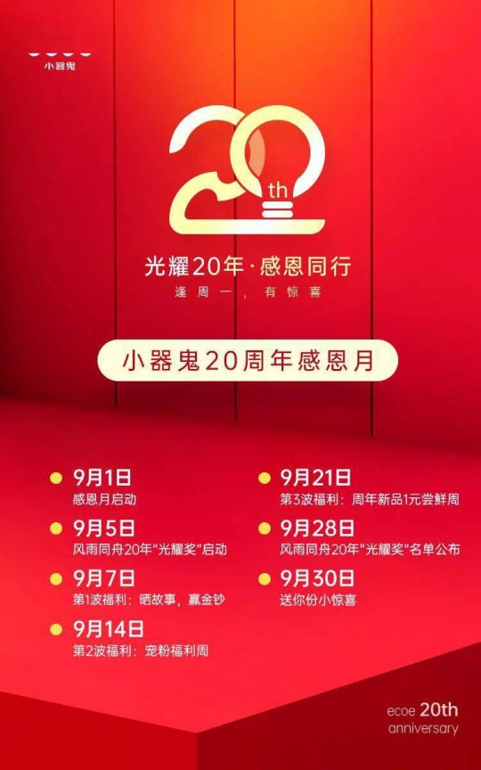 20 年的偉大征程,小器鬼照明感恩一路同行的新老客戶,特在9月隆重推出了小器鬼20周年感恩月,多檔福利傾情巨獻。