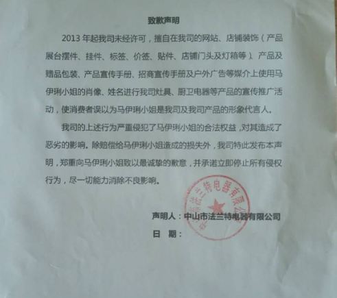 我司的上述行為嚴重侵犯了馬伊琍小姐的合法權益,對其造成了惡劣的影響。除賠償給馬伊琍小姐造成的損失外,我司特此發布本聲明,鄭重向馬伊琍小姐致以最誠摯的歉意,并承諾立即停止所有侵權行為,盡一切能力消除不良影響。