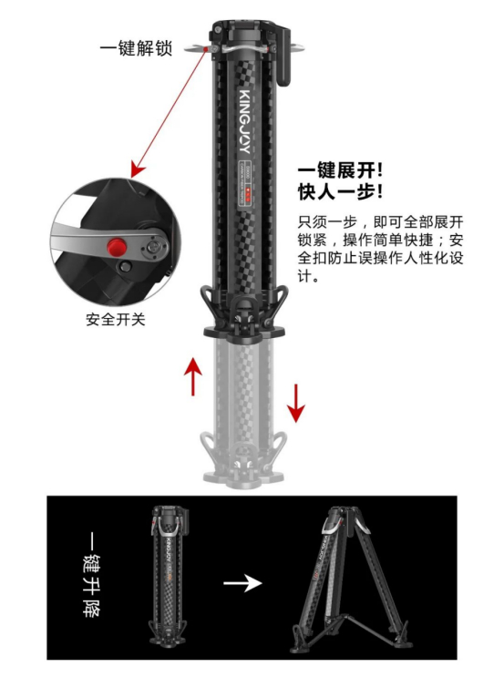 相較于傳統的旋鈕或板扣調節方式,勁捷S9000采用了創新的一鍵鎖定快開快合系統,通過簡單高效的卡扣機制,即可實現四節腳管之間的瞬間收合,無需繁瑣的多步驟操作。即便是在攜帶重型相機及鏡頭組合時,也能輕松實現三腳架高度、角度的快速調節,極大地提升了攝影師的工作效率與拍攝靈活性,是追求高效作業與快速響應拍攝需求的攝影師的理想之選。