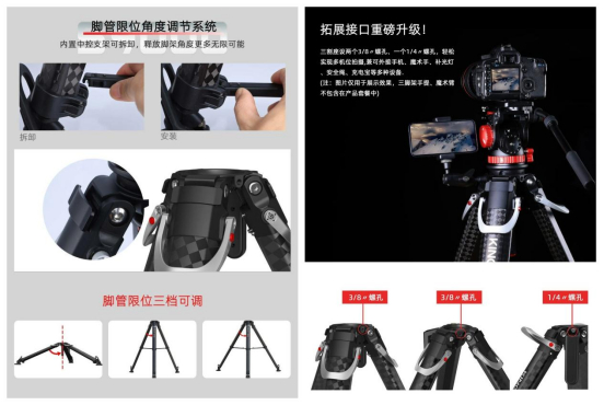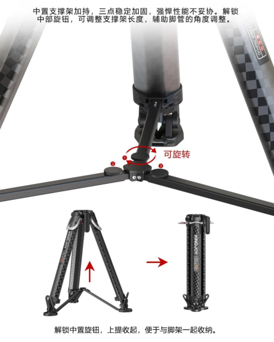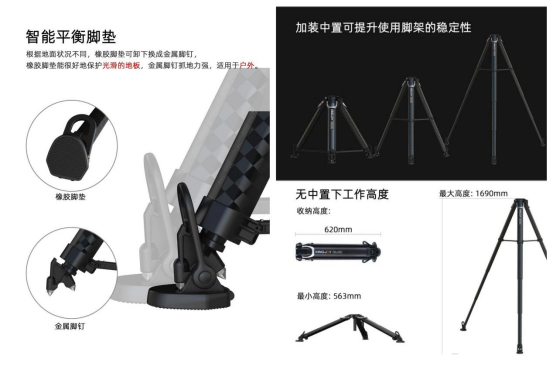 腳管限位角度調節系統,內置中控支架可拆卸,腳管限位三檔可調,釋放腳架角度更多無限可能。