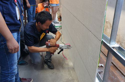 比賽現場泰爾美也向在場的各位工長們展示了其標尺定位石膏板和頂級快裝系統兩款新品。