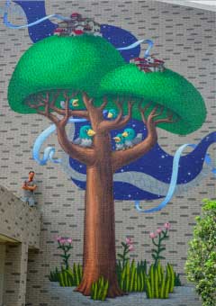 南京市兒童福利院兩幢主題建筑的灰墻是Kislow的絕佳畫板,他用畫筆一點(diǎn)點(diǎn)涂抹著瑰麗的童夢:大樹、飛鳥、銀河、繁星……精致的元素惟妙惟肖,令人浮想聯(lián)翩。而當(dāng)談及作品寓意時(shí),Kislow說道:比如我所展現(xiàn)的參天大樹,一顆樹就像一個(gè)生命體,有根、樹干和樹冠,就像我們的過去、現(xiàn)在和未來。過去是根變成了花草,樹干上的小鳥就像現(xiàn)在福利院里的孩子們,受到大樹的庇護(hù)。“據(jù)Kislow介紹,他非常喜歡中國的傳統(tǒng)文化,當(dāng)他在逛夫子廟時(shí)看到了很具南京特色的騎馬樓和游船畫舫,于是他把這些一起融入進(jìn)去,并在創(chuàng)作中加入一些古城墻的建筑特色,使墻繪細(xì)節(jié)之處具有濃厚的“南京味兒”。