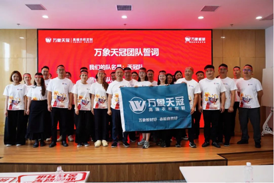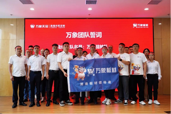 旺德府木業公司總經理唐勇先生帶領萬象天冠品牌戰隊進行宣誓,旺德府家居產業集團總裁王仲豐先生授予象征團隊榮譽的沖刺戰旗。