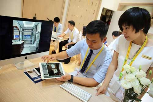 觀眾不僅可以在現場體驗智慧衛浴空間,還能進行五星定制,挑選自己喜歡的廚衛色彩和款式,搭配出個性化定制空間。戴上VR眼鏡,就能看到未來夢想“家”,即可身臨其境般地穿梭在衛浴、陽臺及廚房空間。