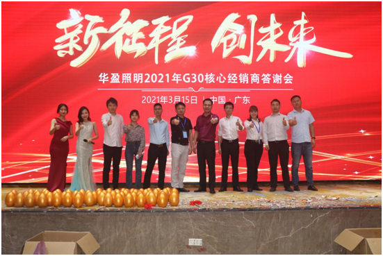 2021年3月15日,華盈照明2021G30核心經銷商答謝會在企業總部——廣東中山隆重舉行!華盈照明總部拿出品質產品及政策誠意力邀核心經銷商蒞臨現場,共同為華盈照明2021年的品牌推廣及市場發展出謀劃策。