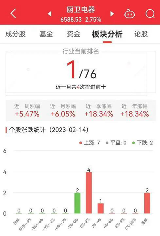 向來反應最為敏銳、迅速、超前的資本市場,是判斷行業是否回暖的絕佳窗口。從此角度來看,廚電行業表現如何?我們將時間線拉到2月14日,當日廚衛板塊全天強勢,整體漲幅2.75%, 7只股票上漲,2只股票下跌。