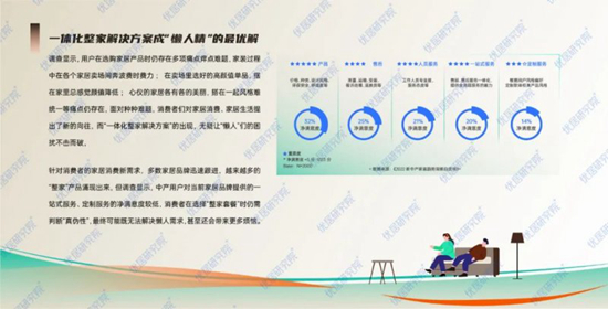 調(diào)查顯示,用戶在選購家居產(chǎn)品時仍存在多項痛點癢點難題,家裝過程中在各個家居賣場間奔波費時費力;在賣場里選好的高顏值單品,擺在家里總感覺顏值降低;心儀的家居各有各的美麗,搭在一起風(fēng)格難統(tǒng)一等痛點仍存在,面對種種難題,消費者們對家居消費、家居生活提出了新的向往,而“一體化整家解決方案”的出現(xiàn),無疑讓“懶人”們的困擾不擊而破。