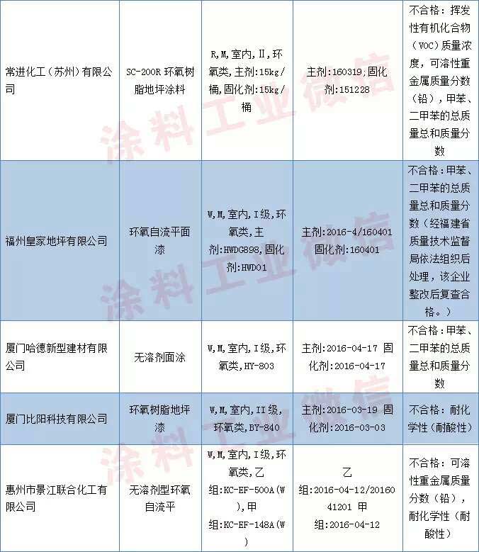 鉻、汞)等16個項目進行了檢驗。抽查發現有7批次產品不符合標準的規定,涉及到揮發性有機化合物(VOC)質量濃度,甲苯、二甲苯的總質量總和質量分數,可溶性重金屬質量分數(鉛),耐化學性(耐酸性)項目。
