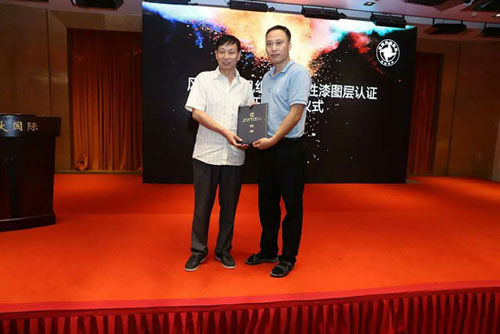 中國可再生能源學(xué)會風(fēng)能專業(yè)委員會秘書長秦海巖為華豹(天津)涂料股份有限公司董事長張蛟頒發(fā)風(fēng)力發(fā)電機(jī)組部件的認(rèn)證證書