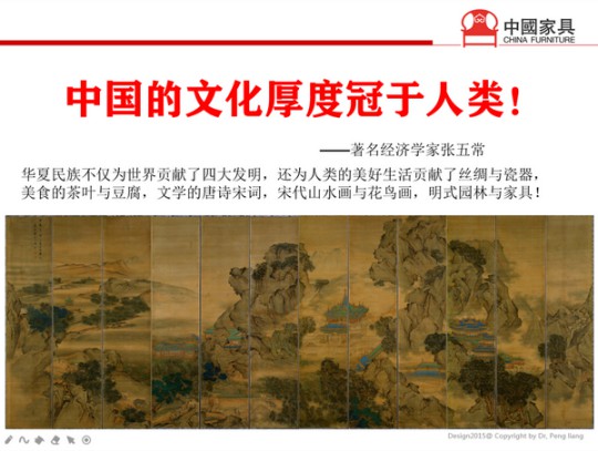 就像著名經濟學家張五常說過的一句話:“中國的文化厚度冠于人類!”張先生認為,未來中國對民族文化保護的市值是無法估量的。華夏民族不僅為世界貢獻了四大發明,還為人類的美好生活貢獻了絲綢與瓷器,美食的茶葉與豆腐,文學的唐詩宋詞,宋代山水畫與花鳥畫,明式園林與家具。而且從夏商周到21世紀,每一個朝代都為美好生活創造了獨特的文化底蘊。而今,我們在這五千年的歷程中隨機選擇幾種事物,都能將其發揚光大。
