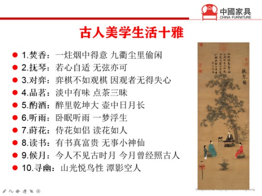 六是從 “柴米油鹽醬醋茶”到“琴棋書畫詩酒花茶”的趨勢。從過去的“柴米油鹽醬醋茶”的溫飽生活開始向“琴棋書畫詩酒花茶”雅致生活的轉變,對家居空間與家具設計都帶來了新的挑戰與機遇。