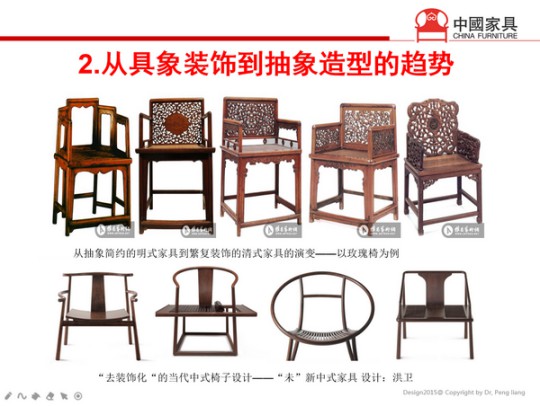 二是從具象裝飾到抽象造型的趨勢。從迷信、崇拜雕刻裝飾的清代風格,回歸到喜歡明代的簡素簡約。無論是建筑、家具,還是服裝等等,都是往這個大趨勢前進。