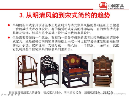 三是從明清風韻到宋式簡約的趨勢。著名明清家具專家田家青,他對明清家具的評分是,從明到清逐漸遞減。但是現在仍然有許多廠家把紅木家具做成“傻大笨粗”的風格,這就是暴殄天物。