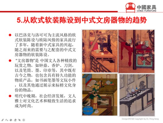 五是從歐式軟裝陳設到中式文房器物的趨勢。以巴洛克與洛可可為主流風格的歐式軟裝陳設與歐陸風情的家具流行了多年,隨著新中式家具的興起,隨之而來的需要與之配套的中式文房器物的軟裝陳設。