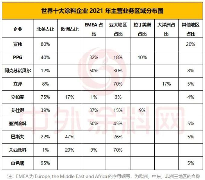 在2022年世界十大涂料企業排行榜上,美國上榜5家(宣偉、PPG、立帕麥、艾仕得、百色熊),德國1家(巴斯夫),日本1家(關西涂料)、新加坡1家(立邦)、荷蘭1家(阿克蘇諾貝爾)和印度1家(亞洲涂料)。 從銷售區域來看,世界十大涂料企業中區域性龍頭企業較多。宣偉、立帕麥、百色熊等銷售區域主要集中于北美地區。立邦、關西涂料等銷售區域則主要集中于亞洲地區。
