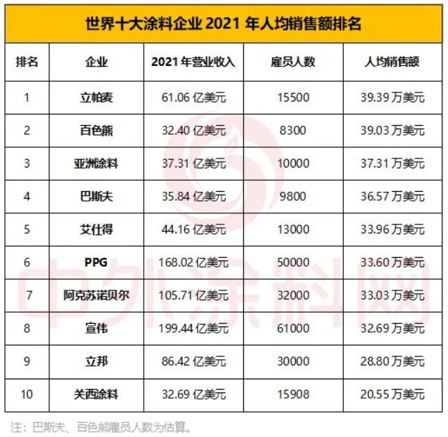 從人均產值來看,立帕麥、百色熊、亞洲涂料位居前三位,分別為39.39萬美元、39.03萬美元、37.31萬美元,平均一人一年銷售近40萬美元,立帕麥無疑是最牛團隊;巴斯夫、艾仕得、PPG、阿克蘇諾貝爾、宣偉、立邦、關西涂料分別位居第4-10位。人均營業收入低于30萬美元有2家,分別是立邦和關西涂料。
