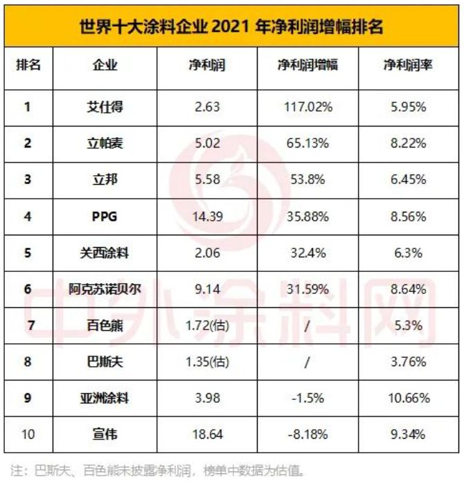 艾仕得凈利暴增117%!亞洲涂料和宣偉賺錢能力最強 盡管新冠疫情反復、原材料漲價等帶來了嚴峻的挑戰,2021年世界十大涂料企業普遍實現了凈利潤提升。除了市場的強勁需求,導致銷量增長帶動利潤上漲外,多數企業通過采購和成本優化方面的開創性工作,降本增效,以及提升產品價格等措施保證了凈利潤增長。