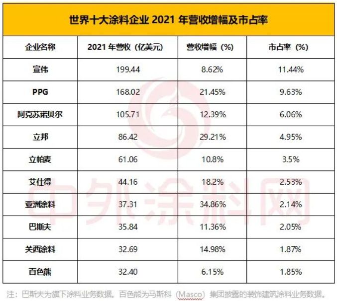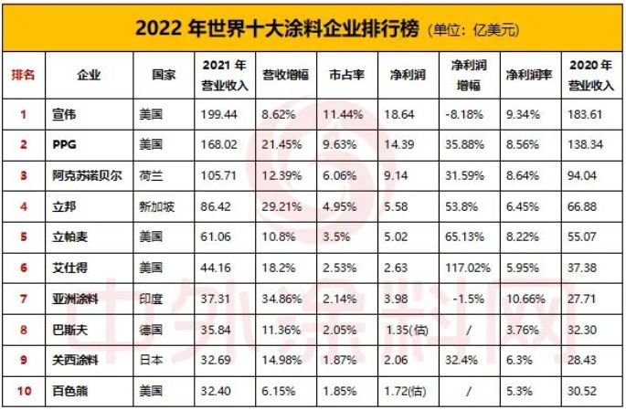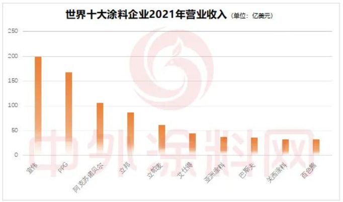 中外涂料網“2022年世界十大涂料企業排行榜”中,美國宣偉以199.44億美元營業收入排名世界第一。排名第二的為PPG,2021年營收收入168.02億美元。阿克蘇諾貝爾以營業收入105.71億美元位居第三位。立邦以86.42億美元位居世界涂料第四位。立帕麥以營業收入61.06億美元位居第五位。艾仕得以44.16億美元位居第六,亞洲涂料以37.31億美元位居第七,巴斯夫以35.84億美元位居第八,關西涂料以32.69億美元位居第九,百色熊以32.40億美元位居第十位。