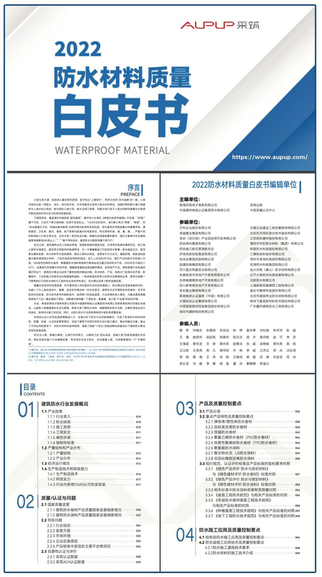 考慮到防水材料在建筑工程中的重要性,珠海采筑電子商務(wù)有限公司聯(lián)合中國(guó)建材檢驗(yàn)認(rèn)證集團(tuán)蘇州有限公司等機(jī)構(gòu)和其他多家知名防水企業(yè),經(jīng)多次研究討論,共同編寫《2022防水材料質(zhì)量白皮書》,以服務(wù)人類健康美好生活為愿景,幫助從業(yè)者了解防水材料,理解建筑防水功能,正確合理地設(shè)計(jì)和選材,指導(dǎo)防水施工和應(yīng)用,助力防水行業(yè)供給側(cè)轉(zhuǎn)型升級(jí)和高質(zhì)量發(fā)展。
