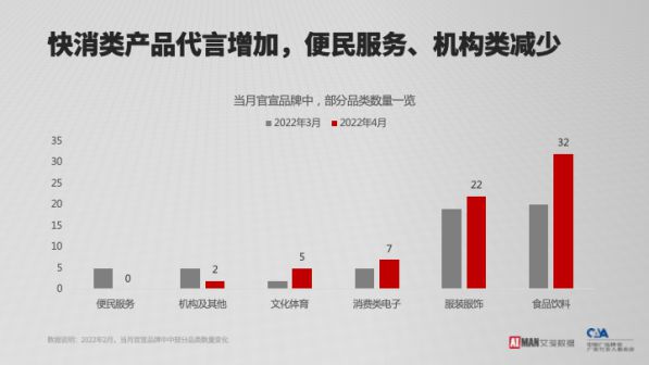 從品類上看,2022年4月,服裝服飾、食品飲料等品類的代言數(shù)量增加,超過了3月。而便民服務(wù)、機(jī)構(gòu)類代言不升反降,官宣數(shù)量低于3月。