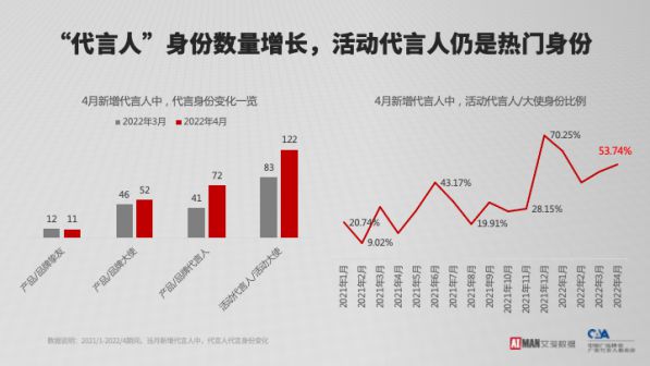 不過,“短平快”的輕量級(jí)代言方式,仍然是很多品牌的選擇。在4月新增的代言中,有53.74%都是“活動(dòng)代言人”或“大使”身份,數(shù)量也從3月的83人次,增長(zhǎng)到4月122人次。