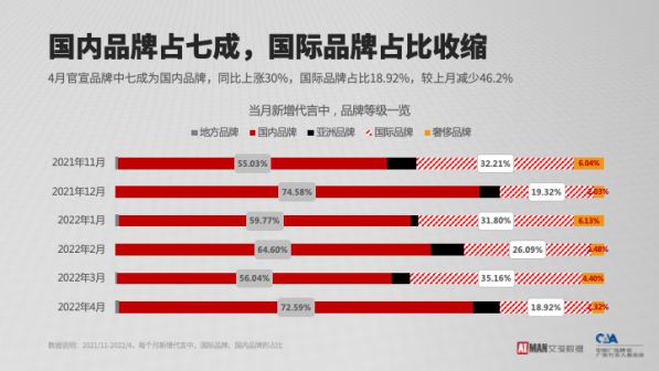 與去年相比,今年4月的新增代言品牌中,占比最多的國(guó)內(nèi)品牌占比繼續(xù)提升,達(dá)到72.59%,同時(shí)也擠壓了國(guó)際品牌、奢侈品牌的市場(chǎng),這兩大類品牌代言占比收縮。