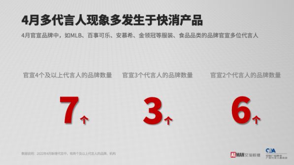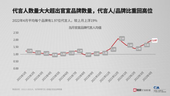 因此,一品牌邀請(qǐng)“多星”代言的現(xiàn)象在4月更為明顯,代言人/品牌比例達(dá)到1.97,平均每個(gè)品牌幾乎要邀請(qǐng)2位代言人。