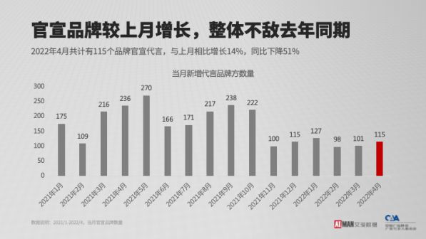 2022年4月,代言市場(chǎng)官宣數(shù)量稍有上漲,共115個(gè)品牌有新增代言官宣,這一數(shù)量與去年同期相比有51%的下降,但比前幾個(gè)月還是有明顯回升。