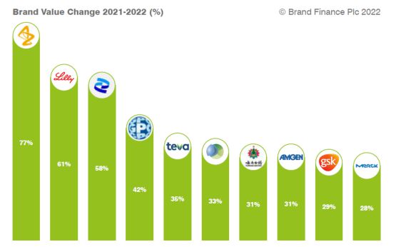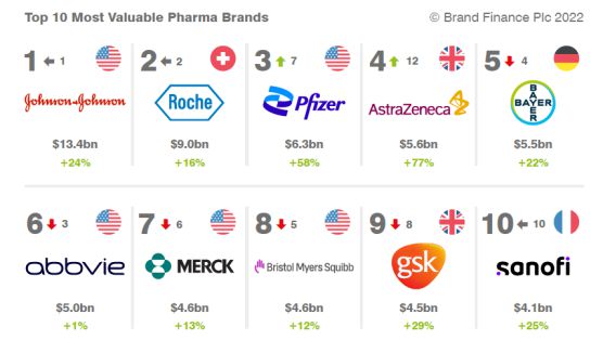 據今年 Brand Finance 最新報告,自新冠疫情爆發后,跨國藥企品牌價值大幅飆升,成為全球家喻戶曉的名字,阿斯利康、輝瑞等跨國藥企研發、提供疫苗,使得世界許多國家和地區因此重新開放,成為增長最快的制藥品牌。