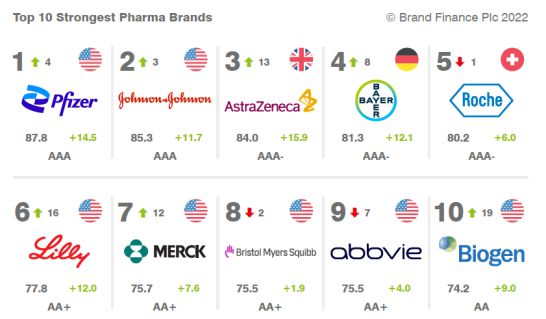 此次排名最受關注的是阿斯利康,由于對新冠疫苗的開發和布局,品牌價值從 2021 年的 32 億美元增長到 56 億美元,增長率達到驚人的 77%,是所有跨國藥企中增長最快的品牌,這也使得其排名從去年的第 12 名直接躍居第 4 位。