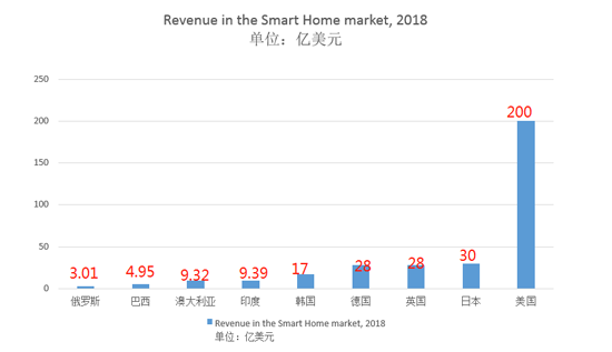 如果具體到某個國家呢?美國、英國、日本、印度等有著怎樣的發展趨勢?本文我們特別為跨電族準備了全球9個國家的智能家居市場數據,有你的目標市場嗎?(注明:以下本文數據來自于統計網站Statista;該市場統計數據不包含智能電視。)