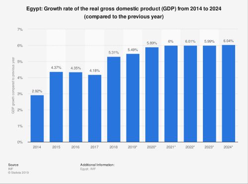 世界銀行于4月初發布了一份有關中東和北非地區(包括埃及)經濟前景的報告。該銀行預計2019年埃及國內生產總值將實現5.5%的增長率,位居中東和北非地區第二,第一為吉布提,預測增長率為7%。世界銀行的報告還預測埃及的GDP增長率將在2020年達到5.8%,并在2021年增長到6%,人均實際GDP增長率將在2019年達到3.7%,到2020年達到4%。
