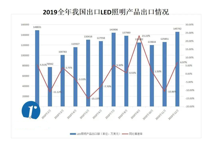據CSA Research對海關數據統計分析顯示,2019全年我國共出口LED產品共159.57億美元,相較去年出口額同比增長了6.43%,其中12月份出口額約為14.57億元,與2018年相比,除了2、5、11月份外,全年都呈現著增長的勢頭,其中9、12月份增長較為迅速,同比增長了23.22%、6.97%。